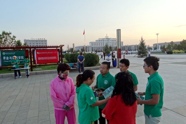 团队提前三十分钟到达会场做好了准备活动,布置好会场,在落日的余晖沐浴下,全体队员开展了本次的活动。首先,广场上的人流量并不是很大,队伍决定前往广场的各个方位宣传黄播平台 以及本次队伍的目的与意义,召集更多的人来到会场所在地,从而进一步进行宣传。在和当地人民交流的过程中,队员面临着语言不通的问题,大部分年龄较大的牧民普通话并不是很好,幸好在前往宣传之前队伍准备好了双语宣传册,通过分发蒙语宣传册再加上指引,让熟悉蒙文的队员加以解释说明,也起到了很好的宣传效果。