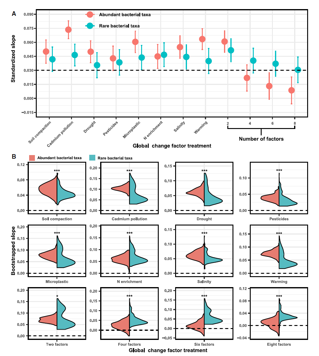 全球变化因子(Global change factors,GCFs),如增温、氮沉降、盐碱化和环境污染等,对陆地生态系统的结构和功能产生了深远影响。生物多样性可以缓冲生态系统的功能以对抗环境变化。然而,土壤微生物多样性,特别是丰富和稀有微生物类群在不同GCFs数量干扰条件下对土壤多功能抗性的调控作用尚缺乏深入研究。