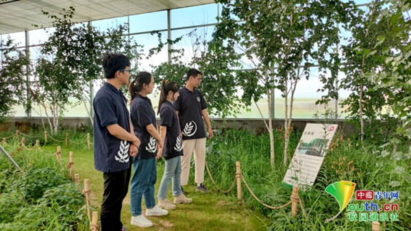 图为团队成员置身模拟原始次生白桦林生态系统,了解白桦树相关知识。中国青年网通讯员 罗盛 摄
