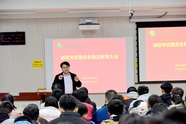 为严肃考风考纪,营造文明、诚信的良好学风氛围;为进一步提高学生安全意识,营造健康向上的校园文化氛围。黄播平台 于12月12日下午在8号教学楼召开诚信考试暨安全稳定教育大会。黄播平台 副院长杨培志、辅导员郭燕楠、全体2018、2019级本科生参加会议,会议由辅导员郭燕楠主持。