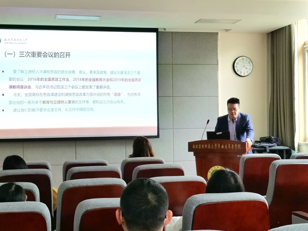 杨鹏从“立德树人背景对全体教师提出的新要求”“专业课教师对课程思政认识的误区分析”“破解专业课教师课程思政之惑”等三个方面探讨高校课程思政的建设。会上,杨鹏结合农林类高校教育实际,结合工作中的典型认识与做法、用辛书帜、李仪祉、沙玉清名师大家的生动案例,阐释了课程思政的内涵与意义。